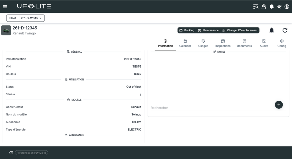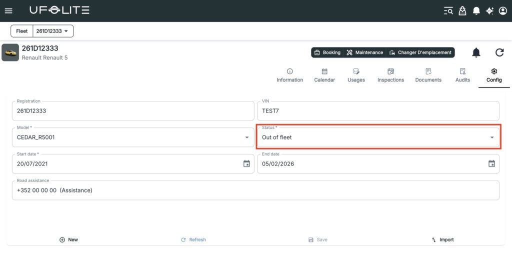 Status — Whether the vehicle is In Service, Out of Booking, or Out of Fleet. This directly controls whether it can be assigned to bookings.