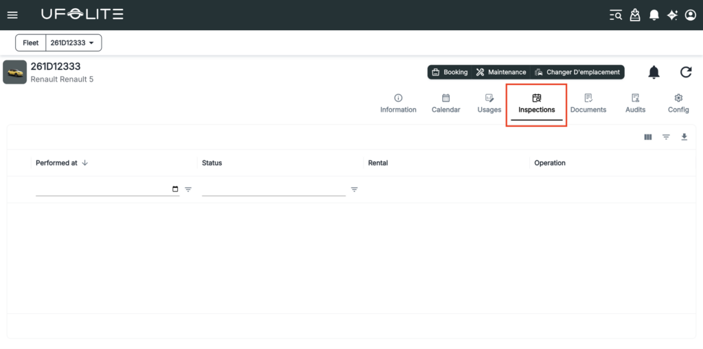 Go to Menu → Fleet → Vehicle Inspections. The list shows each inspection’s reference, the vehicle it’s linked to, the inspection date, and any associated booking or operation.