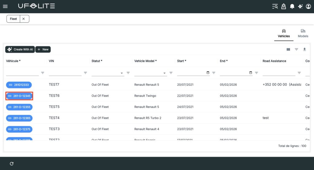 Go to Menu → Fleet → Fleet. The list shows every vehicle with its licence plate, current status, and model at a glance. Click a vehicle to open its full detail page.